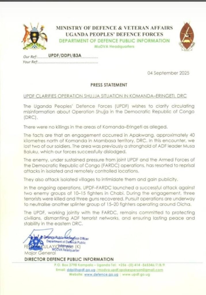 The Uganda People’s Defence Forces (UPDF) has refuted allegations of killings in Komanda–Eringeti, Democratic Republic of Congo, under Operation Shujaa.